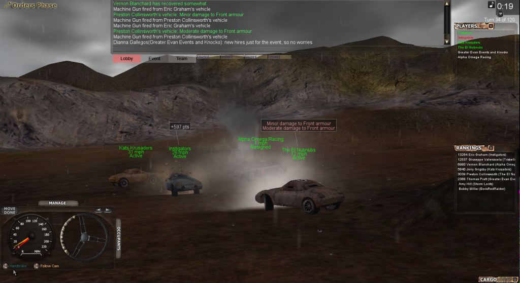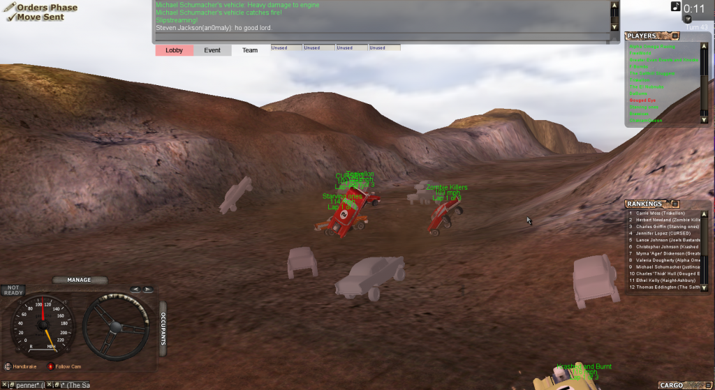 ![]()   Here comes Michelle 'Pink' Floyd, sliding her BPU thru the finish gate and securing The Darkside's first Circuit of Evan Death Rally 2 Championship. With a new leader set in place, I felt the Deadwood Rangers should begin keeping an account of their affairs. This is my first and hopefully last entry, as I am just not cut out for this sort of thing. I am writing this log from a hospital bed due to injuries incurred from a recent engagement with The Turpins. My best friends and confidants, Cindy Wagoner and Cindy Martinson, “The Cindys”, have visited me often and reported on what the Rangers have been up to. The death of Vincent Harris brought a series of power struggles within the ranks that set many a member on edge. Most just grinned and carried on, others voiced their dismay openly, and a few became outright violent and combative, albeit behind my back, towards me… their de-facto leader. I’ll deal with them later. I thought for sure that Cindy Wagoner would have accepted the challenge of leading, but she just didn’t have the courage to do it. However, I knew she could talk pretty much anyone in to doing anything. She was just so smooth like that. She began by propositioning current members but none of them wanted to lead. So I had her go about the task of recruiting outside of our dysfunctional family. Then Eileen Carlton came along. “The Cindys” found her outside of Dexter’s Tavern, bent over the hood of an old and beat up Racoon, cursing and throwing parts here and there. She was surrounded by on-lookers, mostly men trying to sneak a peek up her miniskirt, while she went about trying to pinpoint the problem with the engine. Most of them tried offering her advice, as a way to show her that working on cars was a man’s business. But when she spoke, they could tell she knew exactly what she was taking about and that she wasn’t gonna take no crap from nobody. But they did persist at getting under her skin. Cindy Martinson told me about the conversation that sealed the deal with Eileen… Cindy W, “What’cha work’n on there cutie?” Eileen, “Oh this car is junk I swear!” Random Guy, “Hey Eileen, what’cha gonna do with those carburetors eh? You gonna polish’em up all shiny and paint ‘em pink like your hair?” Eileen, “Shut up punk, I’m trying to see if the reason this dang Racoon won’t start is cause they're fouled. Jake needs this car back by tomorrow and I don’t see none you buggers offering to help me push it across town.” Another Random Guy, “Maybe it’s the battery Eileen. You check that? I bet if you unplugged some of those crazy accessories you got there it’d prolly work.” Eileen, “You see the light under the hood genius? It’s got a charge, a full charge too. Shut up and go back to whatever barstool you crawled off of.” Cindy W, “You pricks need to go away. Now.” Cindy M, “Yeah, or else it’ll get bad for you. Very bad. You know those Dune Worms don’t leave no trace of bodies right? And I know just where to put yours.” Eileen, “I give up, this thing just won’t put out. Period.” Random Guy, “HAHAHA! That’s what we’re saying!” Eileen shot the man an evil glance over her back and he averted his eyes. The Other Random Guy, “Come on Eileen?!” After realizing what he said, he and the other jerks burst in to laughter. Eileen stopped what she was doing, put her tools down, walked over to the guy, sized him up like she was about to kiss him, and then delivered a round-house kick squarely to his jaw, knocking him out cold. They scrambled back to the safety of Dexter’s after that. Cindy W, “Those are some moves you got there Eileen. I’m Cindy, this is Cindy too. We’re from the Deadwood Rangers. I’m gonna say it bluntly… We need someone like you.” Eileen chuckled, “Cindy two? I like that. Say, I heard of you guys. Ya’ll do the grunt work for Skoaly’s Pick-N-Pull right? Yeah I’ll join up. But first, help me push this piece of crap over to Jake’s and you got a deal.” Cindy W, “Sounds good. Oh did I mention you’d be leading?” by Skoaly Deadwood Rangers ![]() Bobby Casper of Northstar died at Lost Oasis. Alvina Link of Tremilvars Terrors died at Road to Somerset. Joseph Jones of buncombe boys died at Under a Bloody Red Sky. Michelle Karcher of Roads to Madness died at Once Upon a Town. Malinda Hannan of Postapocalypse Paladins died at Gates of Somerset. Hector Robinson of The Ironmen died at Northern Desert Circuit. Chad Chisholm of Hot Trax died at Highway to Hell. John `H2The` Rizzo of Pigs o Porking died at Gates of Somerset. Marvin McKenna of Gouged Eye died at Lost Oasis. Timothy Belliveau of qwertypower died at Ring of Death Arena. Robert `Boomer` Tankersley of Colorado Explorers died at Interstate Mythos. Jacqueline Knox of bfrty died at Somerset`s Junkyard, Race Track 3. `Winning` Kristopher Weinberger of The Ironmen died at Road to Gateway Truck Stop. Tania Stewart of The Obsidian Order died at Somerset`s Junkyard, Arena. Carol Vos of Ryslocks Ravagers died at Lost Oasis. Bobby Currie of Ryslocks Ravagers died at Lost Oasis. Tomoko Draper of Angels Six died at Gates of Somerset. Lorenzo `BAMF` Allison of Pigs o Porking died at Gates of Somerset. Stanley Mengel of Demoman Destruction Crew died at Somerset Dirt Racing Track. Lynda King of Gaean Reach died at Double Down Arena. Kris Jones of Apocalypse Tomorrow died at Lost Trail: Broken Ground. Ricky Johnson of Apocalypse Tomorrow died at Lost Trail: Broken Ground. Timothy `The Irishman` McNulty of Street Pizza died at Pathway to Darkness. `Devious` Dennis Parvin of Blackwatch died at Acid Land. Earl `Mojo` Mojica of Blackwatch died at Acid Land. Robert `Doomsday` McKay of Blackwatch died at Acid Land. Luis Hamilton of Storm of 8 died at Gates of Somerset. Frank Rowe of Wasteland Trucking Co. died at Gates of Somerset. Thomas Badger of Roads to Madness died at Shantyville. Erin `Crazy Bitch` Ross of Street Pizza 