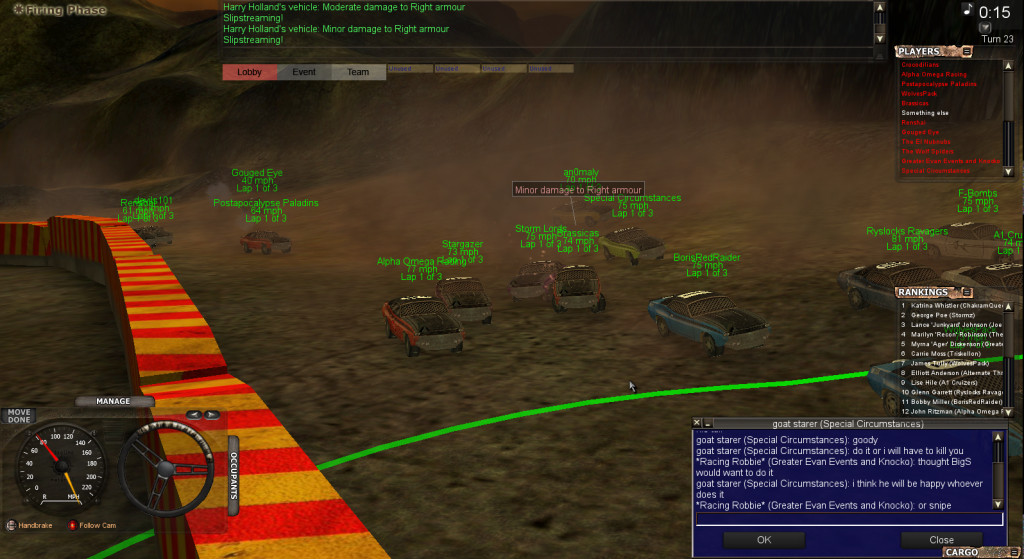 ![]() With the major leagues coming towards their conclusion, the current leaders are: Evan Race Ladder - Old School Perverts In addition, the leaders of the minor leagues are: Circuit of Evan Wilderness Rally I League - Joels Bastards ![]() ![]() Junkyard Wars 2 report. Next up on the Junkyard Wars was a death race on Track 3 of the Junkyard complex, featuring that classic Deathrace, the Snubnose. The start of the race featured a full grid with a good mix of the great and good from all around Evan – even the old Goat had managed to get a driver entered. The question on everyone’s lips was would Joel be able to score enough points to take the win, or would some young pretender step and take the old campaigner down. The start of the race didn’t seem promising with Joel taking a tight inside line and flying up the field, the first time around the hairpin would prove to be make or break time for the B’stards as weapon activation time was rapidly approaching. And he made rounding the hairpin ahead of the first bunch and hitting a clear track, behind him it was mayhem with cars jump over the walls and clear over the tracks, running up the sides of the cliffs or bouncing around like pinballs off the front mounted rams. As he raced away a few rounds from HGGs floated after him, but more missed the mark than marked his racer. The back straight then became a place straight out of hell as individual racers tried to make it down and were smashed to pieces by weapons fire. By the time that the leaders crossed the line there was a number burning wrecks littering the track. In the front, Joel continued with his master class of death racing, slowly catching up with rear placed cars and starting to lap the rear of the field. The 2nd lap saw more flaming death traps started around the track as the numbers of cars still running shrunk. As the race played itself out, Joel finished first rounding off another fine victory for the B’stards and placed himself in untouchable lead in the overall event. The final results were: The finishers are as follows: 1st – Joels Bastards 2nd – DaBums 3rd – Gouged Eye 4th – Special Circumstances 5th – Triskellom 6th – WolvesPack And the overall event table after the second event: 40 – Joels Bastards 18 – Triskellon 15 – Starving Ones 15 – DaBums 12 – Alpha Omega Racing 12 – Gouged Eye 10 – Special Circumstances 8 – The Salthill Sluggerz 6 – Zombie Killers 6 – WolvesPack 4 – Ryslocks Ravagers 3 – F-Bombs 2 - Brassicas 1 – CURSED ![]() Junkyard Wars Event 3 With the overall result decided it was understandable that the turnout for the third event would be lower, with only 8 entries turn out for the combat at Junkyard Arena. But even so the combat turned out to be a furious affair with all the terms throwing themselves in to combat in order to win the final event prize. In the opening exchanges Triskellon found himself up against the organizers, and was able to take an advantage after some tactical circling and knocked the GEEK boys out of the event. At the other end of the arena a 3 way struggle had developed between Kats Krusaders, Instigators and The El Nubnubs which saw Kats Krusaders flying through the air at one point and the Instigators and Nubnubs going head to head at another. After finishing off his opponents Triskellon made a steady approach and was able to make best of advantage of the bit of breathing space he had, to close in to quickly finish off the remaining combatants and take the win. The result is as follows: 1st - Triskellon 2nd - Instigators 3rd – Kats Krusaders 4th – The El Nubnubs 5th – Alpha Omega Racing 6th – Greater Evan Events and Knockout The overall table finished as follows: 40 – Joels Bastards 38 – Triskellon 20 – Alpha Omega Racing 15 – Starving Ones 15 – DaBums 15 – Instigators 12 – The El Nubnubs 12 – Gouged Eye 10 – Special Circumstances 8 – The Salthill Sluggerz 6 – Zombie Killers 6 – Greater Evan Events and Knockout 6 – WolvesPack 4 – Ryslocks Ravagers 3 – F-Bombs 2 - Brassicas 1 - CURSED GEEK events decided that based on the fact that they were the only gang to finish in all 3 events that Triskellon deserved and special prize for this feat. Due to a diplomatic incident following allegations of the hoarding of essential medicines for personal profit, relations have soured between the Civs and the Merchants. ![]() |