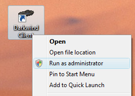 (2) If using Windows XP or 2000, double-click the Darkwind Client icon on your desktop.     If using Windows Vista, right-click the Darkwind Client icon on your desktop, and choose Run As Administrator. ![]()